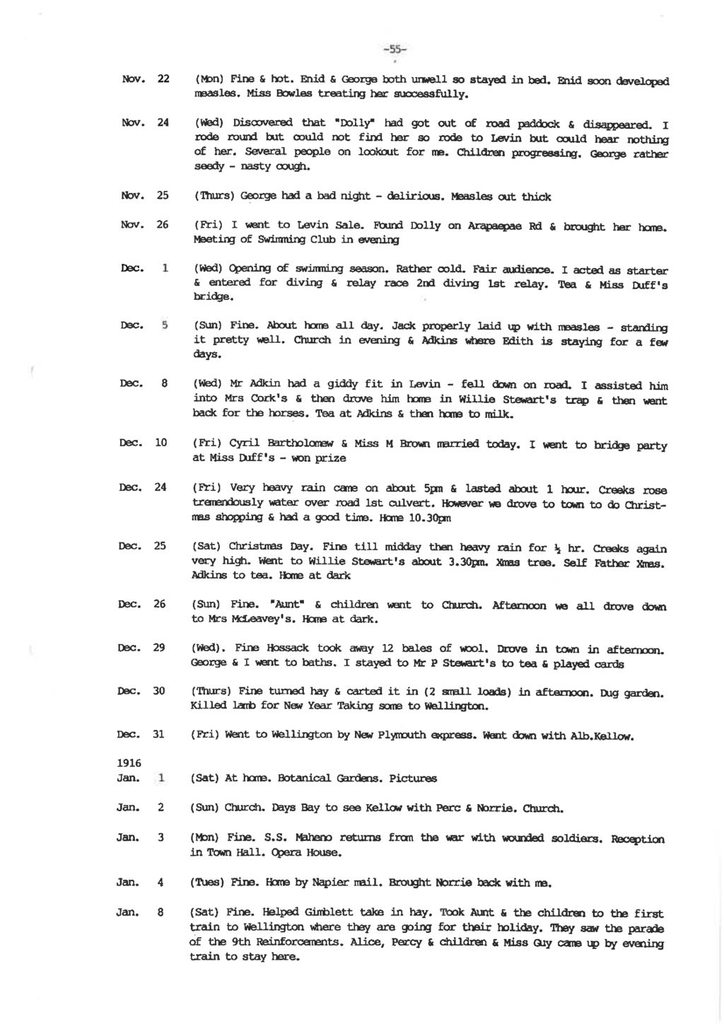 Jan. 1 (Sat) At home. Botanical Gardens. Pictures Jan. 2 (Sun) Church. Days Bay to see Kellow with Perc & Norrie. Church. Jan. 3 (Mon) Fine. S.S. Maheno returns from the war with wounded soldiers. Reception in Town Hall. Opera House. Jan. 4 (Tues) Fine. Home by Napier mail. Brought Norrie back with me. Jan. 8 (Sat) Fine. Helped Gimblett take in hay. Took Aunt & the children to the first train to Wellington where they are going for their holiday. They saw the parade of the 9th Reinforcenents. Alice, Percy & children & Miss Guy came up by evening train to stay here. Jan. 9 (Sun) Drove to Levin in afternoon & Percy went on to Otaki with Mr MCKegg in his car in order to catch the train to Wellington. Drove to cemetary. Jan. 11 (Tues) Fine. Willie Stewart, Gimblett, Becher & Carter came & we harvested my hay - finished by 3 o'clock. Jan. 14 (Fri) Fine. Could not take in Cottle's hay so went to A & W's yards. Fair sale. Jan. 21 (Fri) Percy arrived by midnight train. I drove down in pouring rain to meet him Jan. 23 (Sun) Percy, Alice & children went to Adkins. Bess & I stayed home. Jan. 24 (Mon) Fine. Three Morgans came & shore black faced lambs 204 which I dagged before breakfast, (up at 4.30am) Jan. 26 (Wed) Fine & very hot. Levin Show. Very fair turn-out but too hot to be pleasant. Went to Porteous's for bridge but became very sick & had to come home. Jan. 28 (Fri) Percy returned. Jan. 29 (Sat) Fine. Odd jobs. Made bathing hole in afternoon. Rather small but deep (close on 6ft) Good diving. Close by woolshed. Town in evening with ladies. Heavy rain coming home - wet through. Jan. 30 (Sun) Fine & v.hot. Stayed home all day. E W J Smith & Miss Lancaster up in afternoon (bathing in pool) Jan. 31 (Mon) Fine & v.hot. Made paths round the house in preparation for asphalt Bathing. Will Ross returned to Wellington Feb. 7 (Mon) Farewell to soldiers. Percy gave cornet solo - encored. I among the also started. Successful evening. Finished with dance Feb. 8 (Tues) Fine & very hot. Afternoon all drove up river to swim in °Black Hole". Very enjoyable but Harry had narrow escape from drowning. Clare, Vivian and Agnes also there. Feb. 9 (Wed) Fine & hot. Percy gave lecture on India in Century Ball. Fair audience - rotten lantern. Good lecture. Heavy rain in night Feb. 12 (Sat) Fine. Afternoon Percy & I went to Wellington by New Plymouthmeil. Visited Fern Hill in evening. Stayed at Oriental Bay. Feb. 13 (Sun) Fine. Had a swim with children in morning. Wesley Church. Evening - tea at "FernEdll. Feb. 14 (Mon) Fine. Wool sale tremendous catalogue 39,000 bales. EXcellent prices. W GAdkin 17¼, Kay 17, for fleece, 16½ for lamb. Feb. 15 (Tues) Fine. Took children down town visited Annie who has just undergone operation at private hospital. Improving. Wool Sale. my fleece 11 bales realised 18¼, beating all records. Home by 4pm train. John Davies of Koputaroa died suddenl yaged 77 Feb. 19 (Sat) Fine. Firing rushes & scrub in morning. Feb. 21 (Mon) Fine. Helped Willie Stewart take in hay in afternoon. Firing in morning. Feb. 22 (Tues) Vickers came at 8 o'clock & picked out 140 fat lambs which I put in on schedule. Ma & I went to "Swarry" in evening. Feb. 23 (Wed) Fine & hot, acted as best man to Mr EW J Smith who married Miss Lancaster. Good turnout altogether. Big crcwd. Everything went well. Went for "joyride" to Otaki & saw bride and groom off there. Showers of rice. Home 9pm Feb. 24 (Thurs) Fine. Drove to station to meet Row Pope who is up on holiday. Row & I torched fern in afternoon & had a swim. Cards. Feb. 26 (Sat) Firing all day on Terrace & back hill. Fires went fairly well. Mar. 1 (Wed) Mrs, Miss & Percy McLeavey up in evening. Mar. 2 (Thurs). Fine. Row & Put in day repairing fences & pulling penny royal. Mar. 3 (Fri) Ma Row & I went to farewell to troopers. Raw sang "The Gauntlet" I danced till midnight. Mar. 5 (Sun) Fine. Stayed at home in morning. All drove up river in afternoon to "Black Hole" & had a dip. Mar. 8 (Wed) Battle of Verdun still raging & been going about a week. Mar. 15 (Wed) Went to Garden Party at Mrs Bowens. Ran Quoits competition & collected 31/6 Took 2nd prize hat trimming. Took about 13 pds. Mar. 18 (Sat) Went to Levin to recruiting meeting. Mar. 19 (Sun) Kirkcaldie & I motored to see Mr Wright to canvass the district for recruits. Drove to Lake in evening. Mar. 25 (Sat) Heavy storm of rain in morning but weather cleared about 9 o'clock. Met Napier Mail & brought Miss Bowles & children home. All the children & Ro & I had a bathe. George & Enid had their first dive. I drove Alice, Bessie & children to catch Nea Plymouth Express for Wellington. End of holiday. Mar. 27 (Mon)