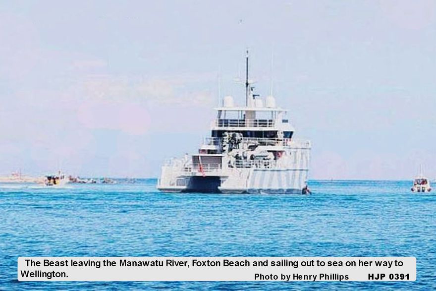 HJP 0391 The Beast leaving the Manawatu River, Foxton Beach and sailing out to sea on her way to Wellington 27-2-2019