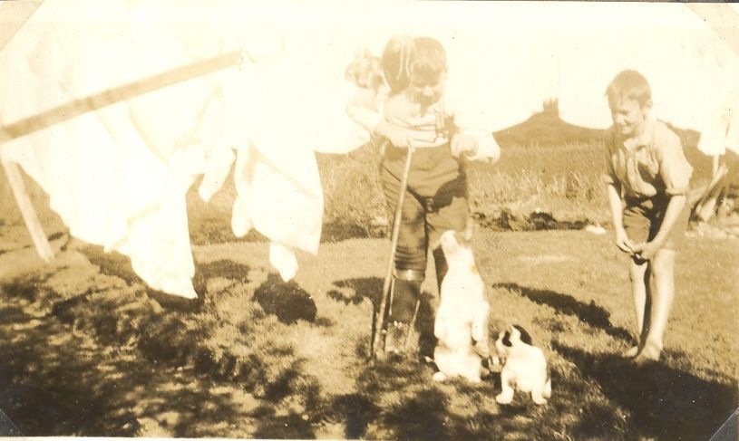 Stewart Ransom and Tony Wakelin in the garden with Togo the cat standing on his hind legs. Second cat is crouched net to Togo. It looks like washing day in the Ransom household.