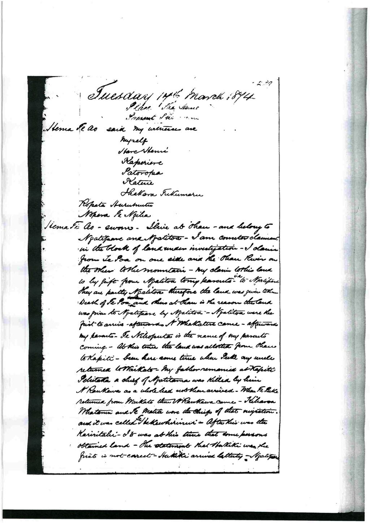 In 1862 there was a large committee meeting called a relative to this land by Hare Hemi and Hukiki, I objected to Hukiki together with the majority of Ngati Raukawa. Parakaia Te Poupa presided at the meeting and Hanita and Te Kingi, Te Ahoaho ,Te Wanui and Henare Herekau. Hukiki was objected, my line was adopted. I was to be in the middle of Hare Hemi on one side Hukiki on the other nothing was said about Aperahama at this time.