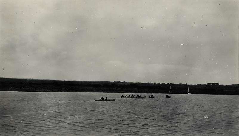Re-enactment of the first settlers arriving in Foxton during the Foxton Centennial Celebrations, 1955. This photograph shows a group of boats on the Manawatu River playing the role of the settlers from Paiaka coming downstream.