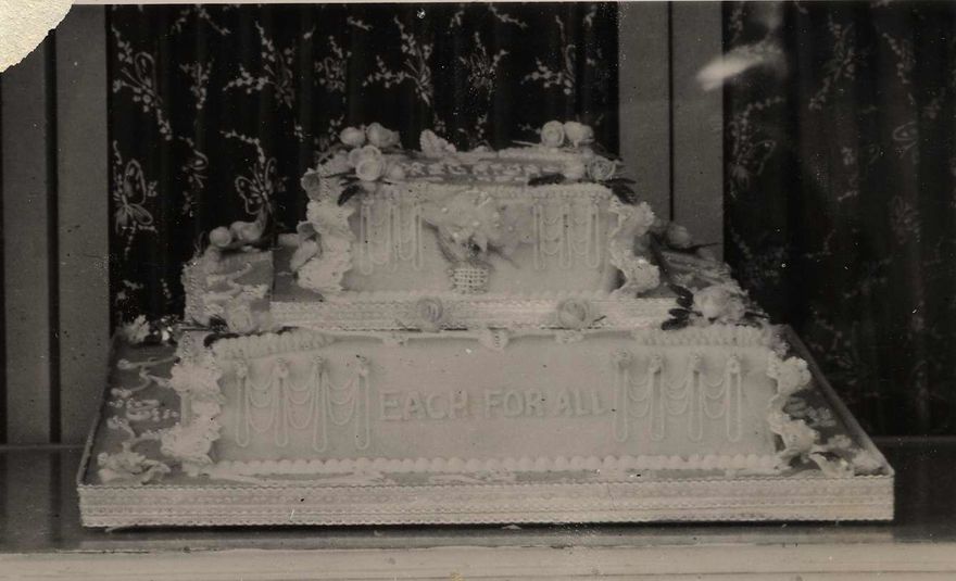 Foxton School Reunion Cake 1954. The two tiered cake has the school’s motto “Each For All” iced on the lower tier.