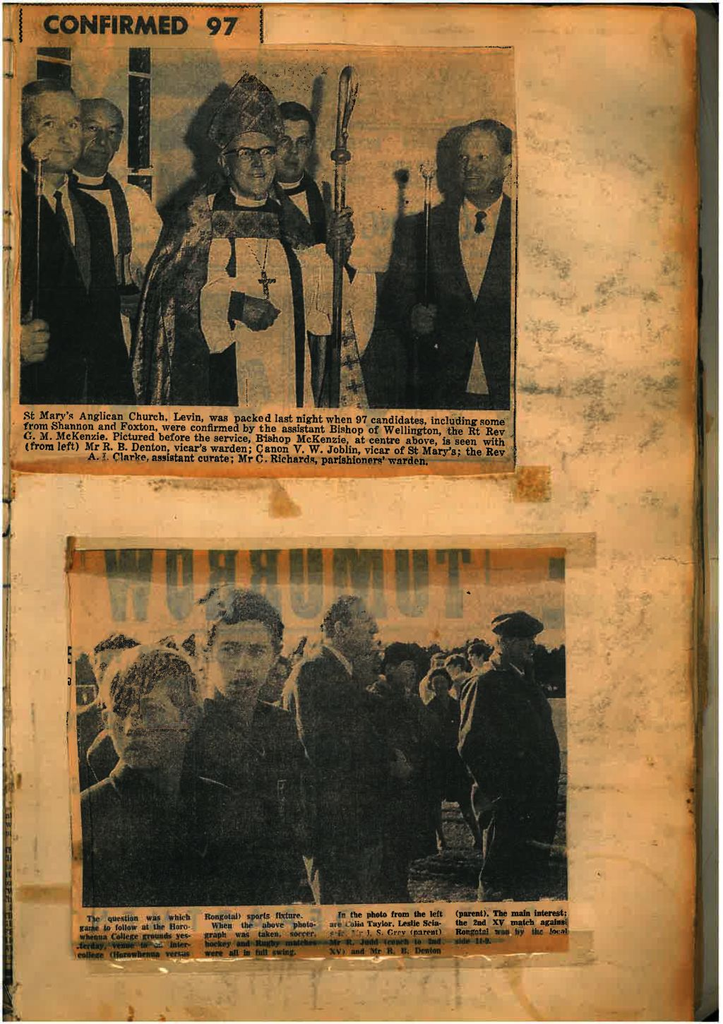 Top Photo - "Confirmed 97" - St Mary's Anglican Church Levin was packed when 97 candidates including some from Shannon & Foxton were confirmed by the Assistant Bishop of Wellington, the Rt Rev G M McKenzie. Photo from left - Mr R B Denton, vicar's warden, Canon V W Joblin, vicar of St Mary's, The Rev A I Clarke, assistant curate & Mr C Richards, parishioners warden.
