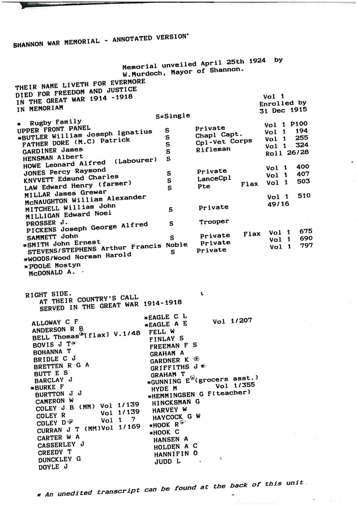 Notes on Annotated Shannon War Memorial