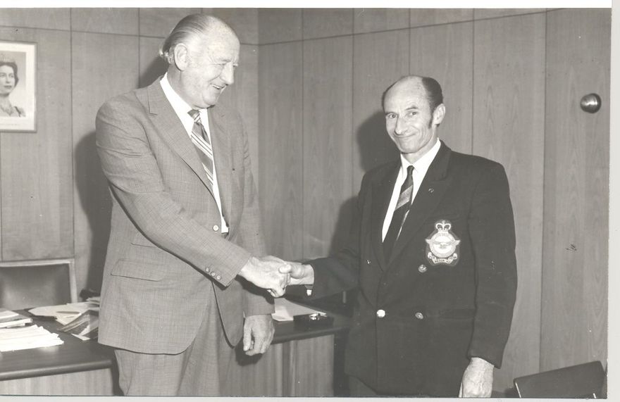 Shaking hands. Man on right may be ex-airforce.