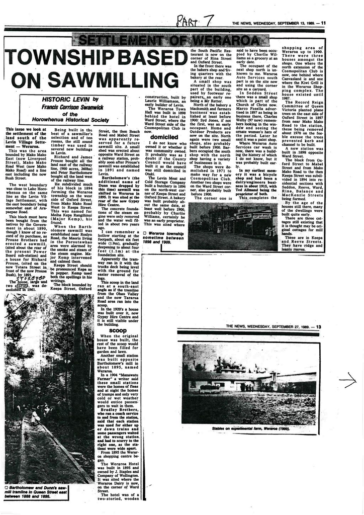 The block bounded by Keepa Street, Oxford Street, the then Beach Road and Mabel Street was apparently reserved for a future sawmill site. A small shed was erected about opposite Ward Street as a railway station, probably soon after Prouse’s sawmill was established in 1891 and named Levin.