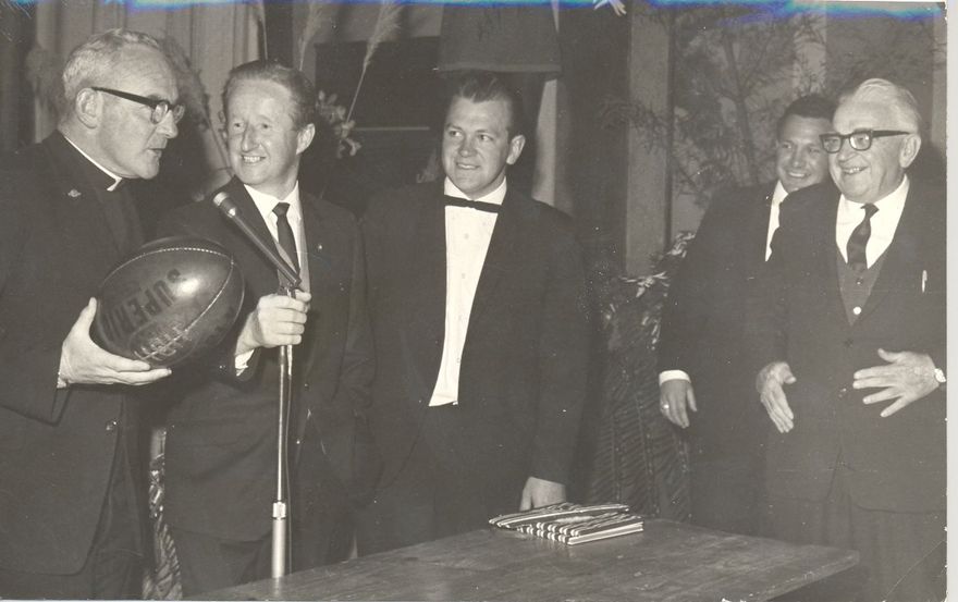 Group of 5 men (?, Rev Grosse, John Heatherwick, Martin Winiata (coach of Rahui), ?) at function 1 B&W photo print