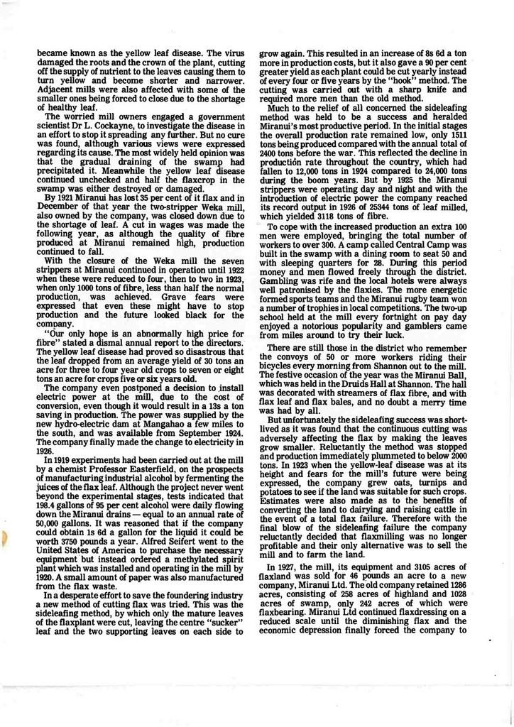 But unfortunately the sideleafing success was shortlived as it was found that the continuous cutting was adversely affecting the flax by making the leaves grow smaller. Reluctantly the method was stopped and production immediately plummeted to below 2000 tons. In 1923 when the yellow-leaf disease was at its height and fears for the mill's future were being expressed, the company grew oats, turnips and potatoes to see if the land was suitable for such crops. Estimates were also made as to the benefits of converting the land to dairying and raising cattle in the event of a total flax failure. Therefore with the final blow of the sideleafing failure the company reluctantly decided that flaxmilling was no longer profitable and their only alternative was to sell the mill and to farm the land.