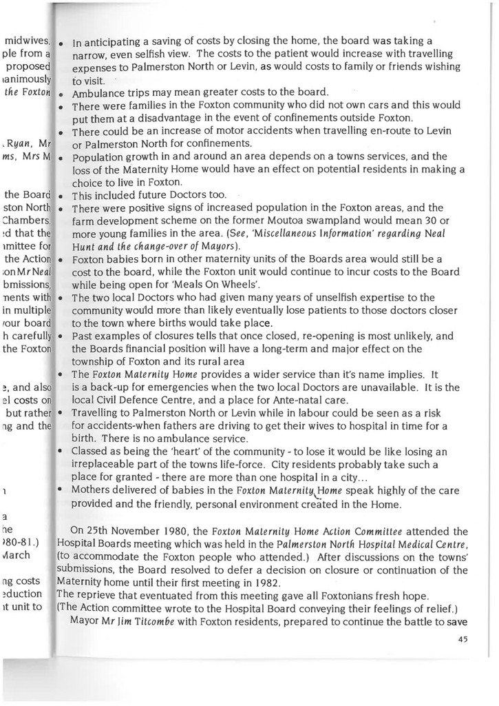 On 25th November 1980, the Foxton Maternity Home Action Committee attended the Hospital Board's meeting which was held in the Palmerston North Hospital Medical Centre, (to accommodate the Foxton people who attended.) After discussions on the towns' submissions, the Board resolved to defer a decision on closure or continuation of the Maternity home until their first meeting in 1982.The reprieve that eventuated from this meeting gave all Foxtonians fresh hope.