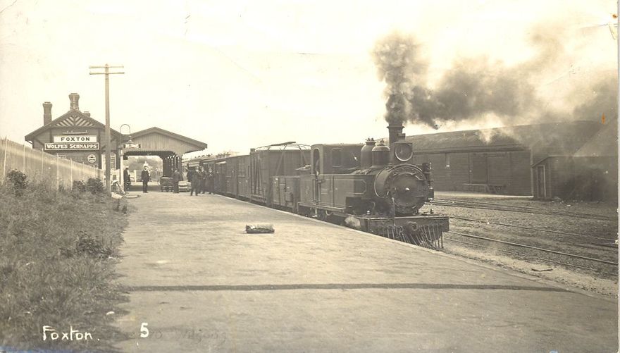 Photo Postcard showing the Foxton Railway Station and platform with train steamed up and package on platform.