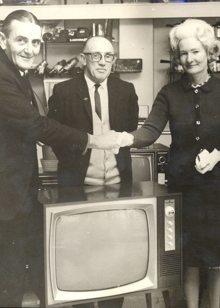Penciled on back - Mrs P. Douglas winner of a competition held in conjunction with the Farmer’s 60th Jubilee. Centre: Mr B.W.G. Bryce, Local Mger. Left: Central Gp mgr of Farmer’s, Mr L.P. Brown of Wanganui. Thurs. July 10, 1969.