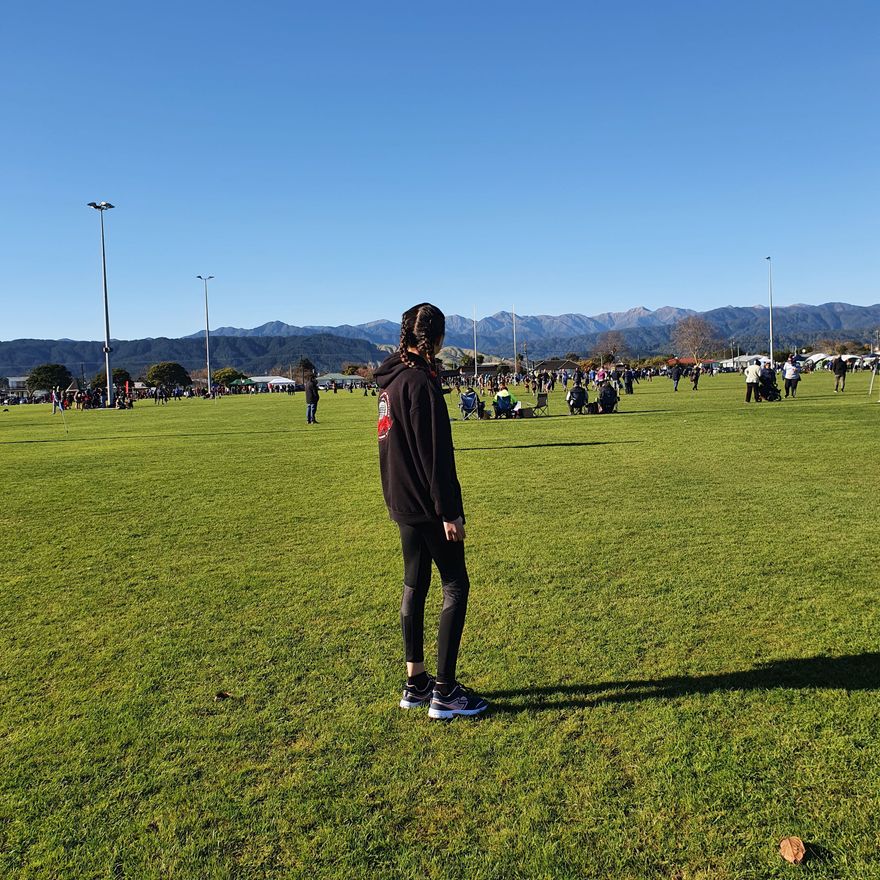 Moko watching winter rugby at Playford Park with view of Tararua Te Maunga - #CaptureYourHorowhenua