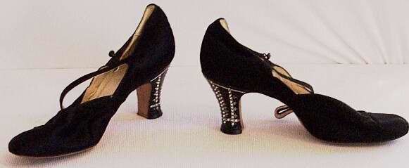 One pair of size 5, black satin evening shoes with diamante trimmed heels and diamante studded button.