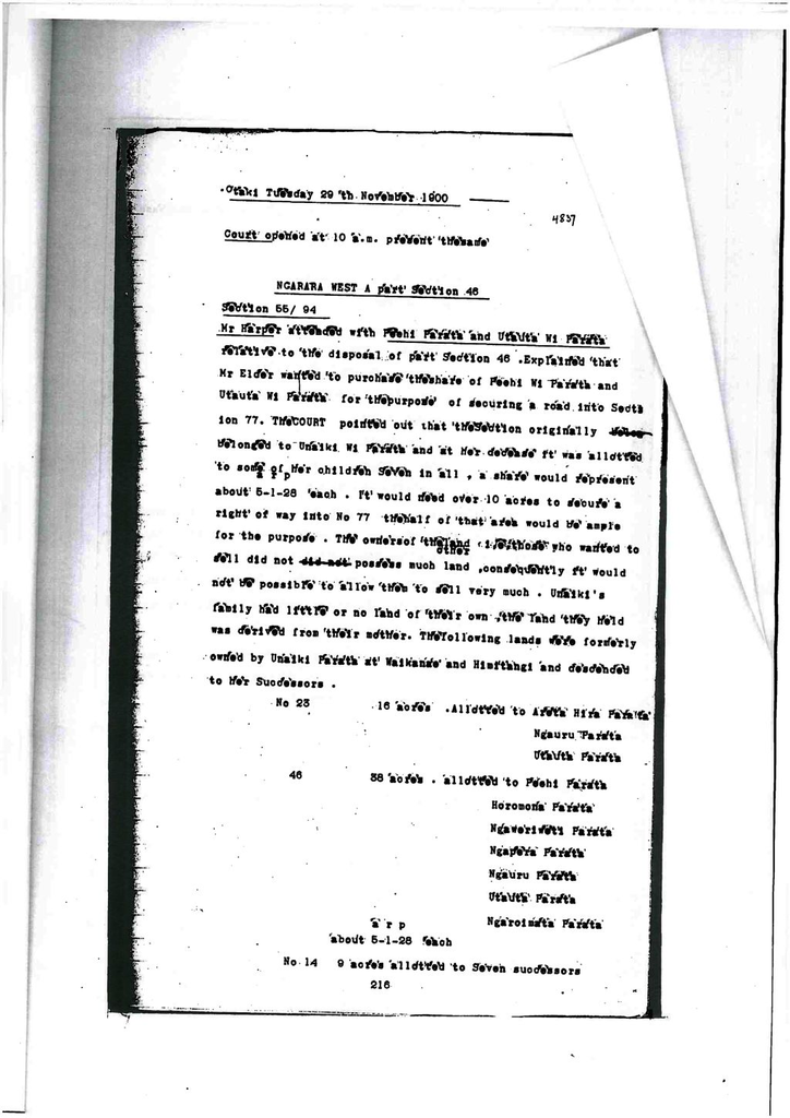 Mr Harper attended with Peehi Parata and Utauta Wi Parata relative to the disposal of part Section 46. Explained that Mr Elder wanted to purchase the share of Peehi Wi Parata and Utauta Wi Parata for the purpose of securing a road into Section 77. The court pointed out that the section originally belonged to Unaiki Wi Parata and at her decease it was allotted to some of her children seven in all, a share would represent about 5-1-28 each. It would need over 10acres to secure a right of way into No77 the half of that area would be ample for the purpose. The owners of the other land i.e. those who wanted to sell did not possess much land, consequently it would not be possible to allow them to sell very much. Unaiki’s family had little or no land of their own, the land they held was derived from their mother. The following lands were formerly owned by Unaiki Parata at Waikanae and Himitangi and descended to her successors.