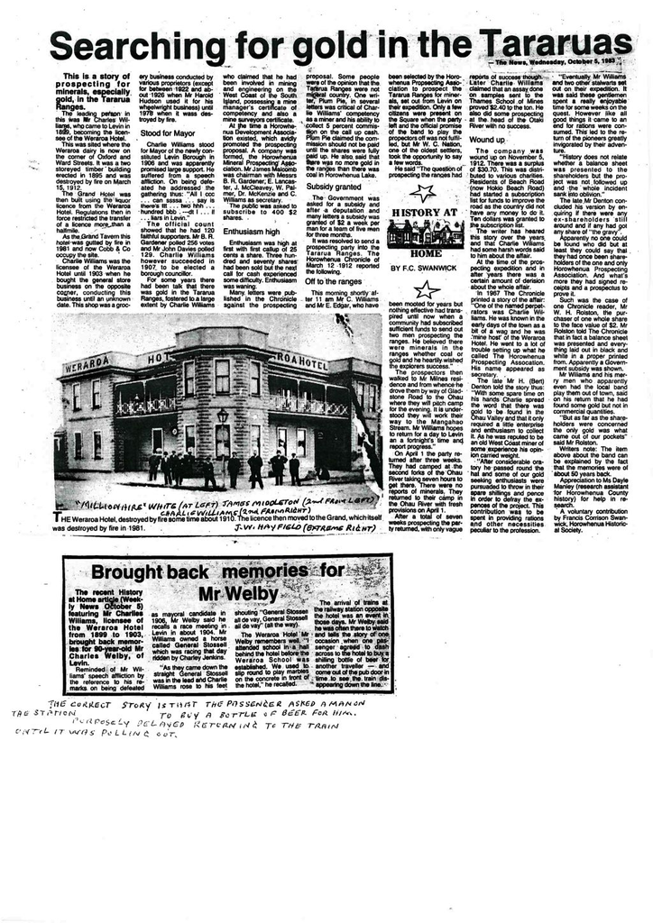 In 1967 the Chronicle printed a story of the affair. “One of the named perpetrators was Charlie Williams. He was known in the early days of the town as a bit of a wag and he was ‘mine host’ of the Weraroa Hotel. He went to a lot of trouble setting up what he called the Horowhenua Prospecting Association. His name appeared as secretary.