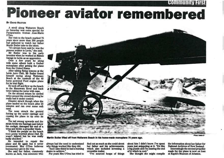After taking flying lessons at the Levin Aero Club, Mr Butler found himself racing along Waiterare Beach at the controls of the 40 horse powered Ford engine plane for its trial flight.