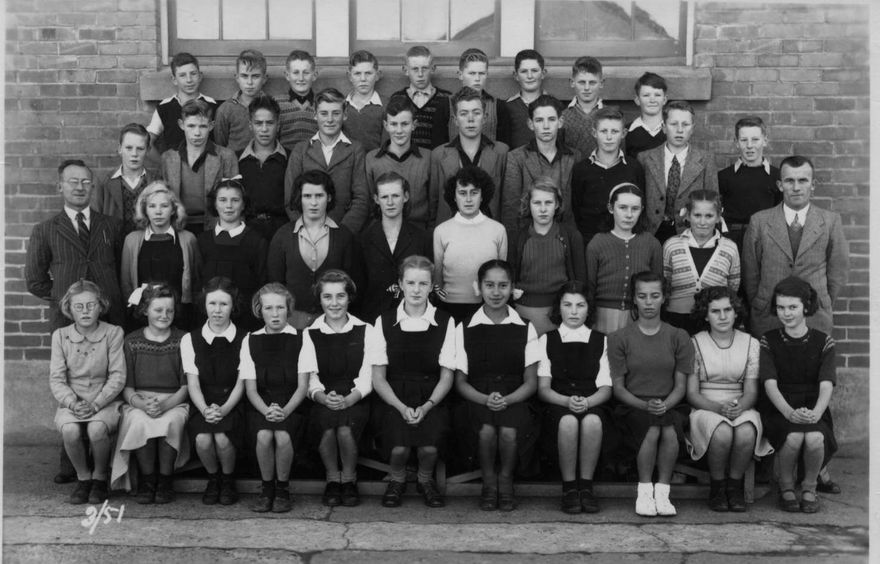 2nd Row: Mr J. Elder (teacher), Dawn Christensen, Jocelyn Barber, Gwenda Betty, Ora Shailer, Jean Reid, Shirley Burnard, Marion Smith, Betty Chard, Mr Blacklock (?or Carew) (teacher).