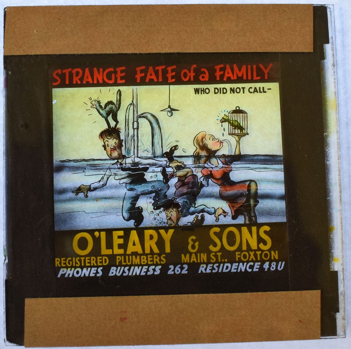 Because these slides were inexpensive to produce, local businesses could afford to take out advertising with a handful of local cinemas. This ad for a Foxton plumber gives a warning to those thinking of doing a bit of DIY! According to the Yellow Pages O'Leary and Sons were founded in 1956.