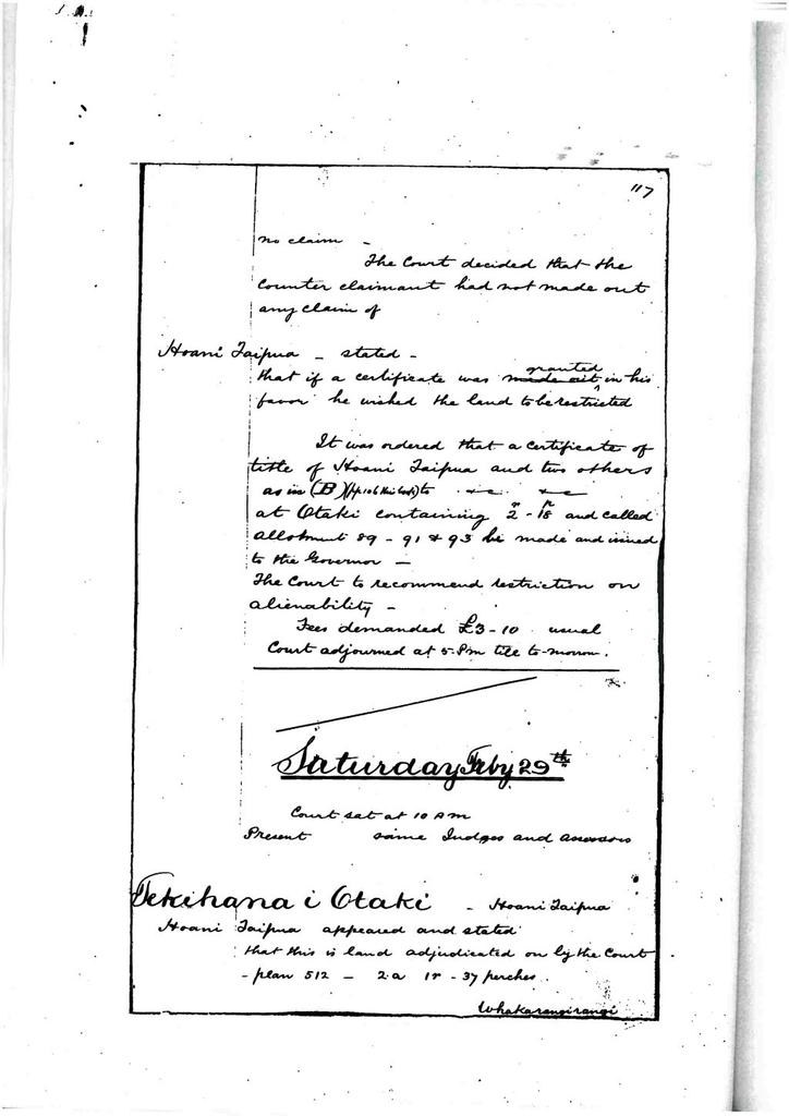 Hoani Taipua appeared and stated that the land had been surveyed by Mr. Knight about 3 weeks since. The plan was not ready.