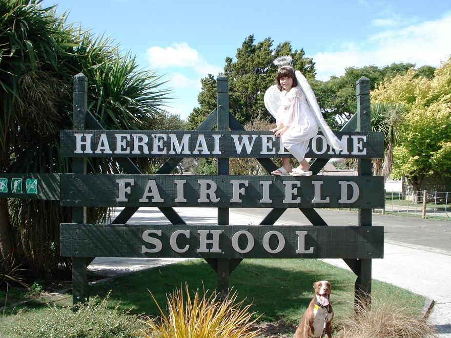 Clue 14 - Our darling angels decided that the Fairfield School sign made a good angel stage. Life is a school of angels.