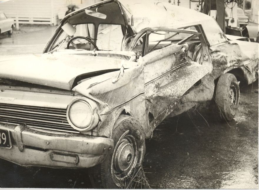 The car in which Tracey Anne Cameron (8), was travelling when hit by a train at the Bath Street crossing, she died in P.N. Hospital. Mary Patricia Cameron [sister ?, mother ?] died at the scene of the accident.