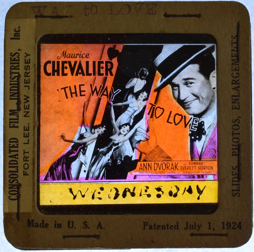 The theatre was the 'Coronation Hall' and it still stands in Foxton today as the home of the MAVtech Museum. It is still a working cinemas as well! This slide would have been screened during other films to advertise 'The Way To Love'. Soon to be released features were known as 'coming attractions'. The projectionist has written the day the film was to play in removable ink at the bottom of the slide.