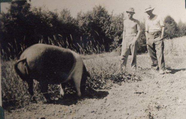 Two men admiring a very large pig (pig is black and has a white band around its front quarters.