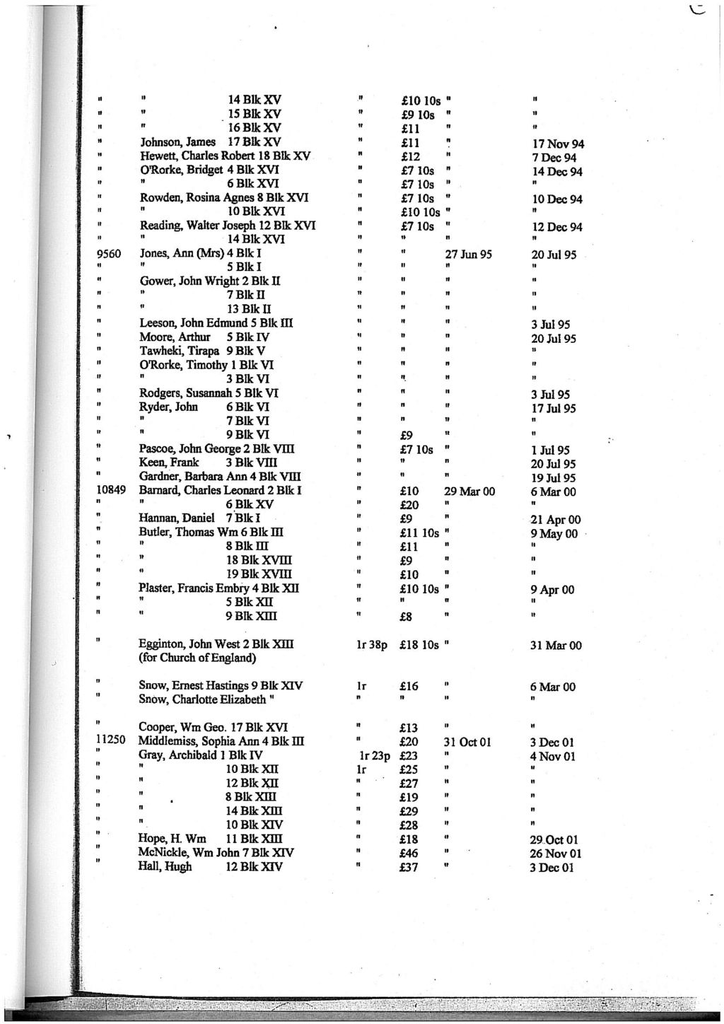 App Name Sec BLK Area Price Sold Pd 9386 Prouse, Clara Anna 14 Blk XV 1r £10 10s 14-Nov-94 8-Dec-94 9386 Prouse, Clara Anna 15 Blk XV 1r £9 10s 14-Nov-94 8-Dec-94 9386 Prouse, Clara Anna 16 Blk XV 1r £11 14-Nov-94 8-Dec-94 9386 Johnson, James 17 Blk XV 1r £11 14-Nov-94 17-Nov-94 9386 Hewett, Charles Robert 18 Blk XV 1r £12 14-Nov-94 7-Dec-94 9386 O'Rorke, Bridget 4 Blk XVI 1r £7 10s 14-Nov-94 14-Dec-94 9386 O'Rorke, Bridget 6 Blk XVI 1r £7 10s 14-Nov-94 14-Dec-94 9386 Rowden, Rosina Agnes 8 BIk XVI 1r £7 10s 14-Nov-94 10-Dec-94 9386 Rowden, Rosina Agnes 10 Blk XVI 1r £10 10s 14-Nov-94 10-Dec-94 9386 Reading, Walter Joseph 12 BIk XVI 1r £7 10s 14-Nov-94 9386 Reading, Walter Joseph 14 Blk XVI 1r £7 10s 14-Nov-94 9560 Jones, Ann (Mrs) 4 BIk I 1r £7 10s 27-Jun-95 20-Jul-95 9560 Jones, Ann (Mrs) 5 Blk I 1r £7 10s 27-Jun-95 20-Jul-95 9560 Gower, John Wright 2 Blk II 1r £7 10s 28-Jun-95 9560 Gower, John Wright 7 Blk II 1r £7 10s 29-Jun-95 9560 Gower, John Wright 13 Blk 11 1r £7 10s 30-Jun-95 9560 Leeson, John Edmund 5 BIk III 1r £7 10s 1-Jul-95 3-Jul-95 9560 Moore, Arthur 5 Blk VI 1r £7 10s 27-Jun-95 20-Jul-95 9560 Tawheki, Tirapa 9 Blk V 1r £7 10s 27-Jun-95 20-Jul-95 9560 O'Rorke, Timothy 1 Blk IV 1r £7 10s 27-Jun-95 20-Jul-95 9560 O'Rorke, Timothy 3 Blk IV 1r £7 10s 27-Jun-95 20-Jul-95 9560 Rodgers, Susannah 5 Blk VI 1r £7 10s 27-Jun-95 3-Jul-95 9560 Ryder, John 6 Blk VI 1r £7 10s 27-Jun-95 20-Jul-95 9560 Ryder, John 7 Blk VI 1r £7 10s 27-Jun-95 20-Jul-95 9560 Ryder, John 9 Blk VI 1r £9 27-Jun-95 17-Jul-95 9560 Pascoe, John George 2 Blk VII 1r £7 10s 27-Jun-95 1-Jul-95 9560 Keen, Frank 3 Blk VIII 1r £7 10s 27-Jun-95 20-Jul-95 9560 Gardner, Barbara Ann 4 Blk VIII 1r £7 10s 27-Jun-95 19-Jul-95 1r 27-Jun-95 10849 Barnard, Charles Leonard 2 Blk I 1r £10 29-Mar-00 6-Mar-00 10849 Barnard, Charles Leonard 6 Blk XV 1r £20 29-Mar-00 6-Mar-00 10849 Hannan, Daniel 7 Blk I 1r £9 29-Mar-00 21-Apr-00 10849 Butler, Thomas Wm 6 Blk III 1r £11 10s 29-Mar-00 9-May-00 10849 Butler, Thomas Wm 8 Blk III 1r £11 29-Mar-00 9-May-00 10849 Butler, Thomas Wm 18 BIk XVIII 1r £9 29-Mar-00 9-May-00 10849 Butler, Thomas Wm 19 Blk XVIII 1r £10 29-Mar-00 9-May-00 10849 Plaster, Francis Embry 4 Blk XII 1r £10 10s 29-Mar-00 9-Apr-00 10849 Plaster, Francis Embry 5 Blk XII 1r £10 10s 29-Mar-00 9-Apr-00 10849 Plaster, Francis Embry 9 Blk XIII 1r £8 29-Mar-00 9-Apr-00 10849 Egginton, John West (for Church of England) 2 Blk XIII lr 38p £18 10s 29-Mar-00 31-Mar-00 10849 Snow, Ernest Hastings 9 Blk XIV 1r £16 29-Mar-00 6-Mar-00 10849 Snow, Ernest Hastings 9 Blk XIV 1r £16 29-Mar-00 6-Mar-00 10849 Cooper, Wm Geo. 17 Blk XVI 1r £13 29-Mar-00 11250 Middlemiss, Sophia 4 BIk III 1r £20 31-Oct-01 3-Dec-01 11250 Gray, Archibald 1 Blk IV 1r 23p £23 31-Oct-01 4-Nov-01 11250 Gray, Archibald 10 Blk X11 1r £25 31-Oct-01 4-Nov-01 11250 Gray, Archibald 12 Blk X11 1r £27 31-Oct-01 4-Nov-01 11250 Gray, Archibald 8 BIk XIII 1r £19 31-Oct-01 4-Nov-01 11250 Gray, Archibald 14 BIk XIII 1r £29 31-Oct-01 4-Nov-01 11250 Gray, Archibald 10 Blk XIV 1r £28 31-Oct-01 4-Nov-01 11250 Hope, H. Wm 11 Blk XIII 1r £18 31-Oct-01 29-Oct-01 11250 McNickle, Wm John 7 Blk XIV 1r £46 31-Oct-01 26-Nov-01 11250 Hall, Hugh 12 Blk XIV 1r £37 31-Oct-01 3-Dec-01