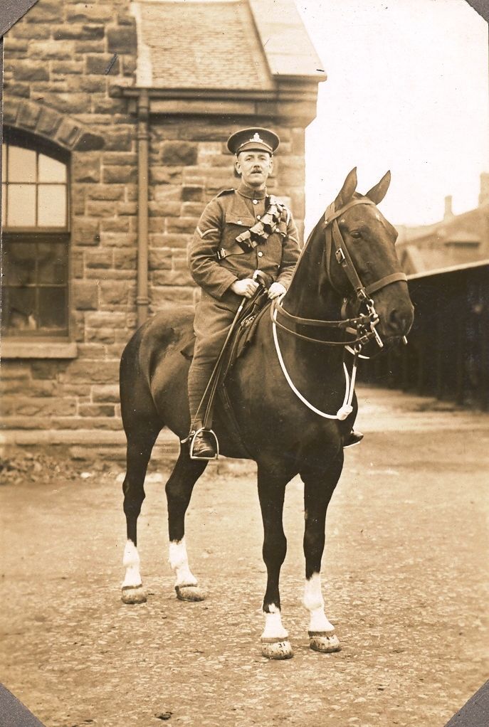 Mounted Lance Corporal on horseback. He is wearing a bandalier over his shoulder.