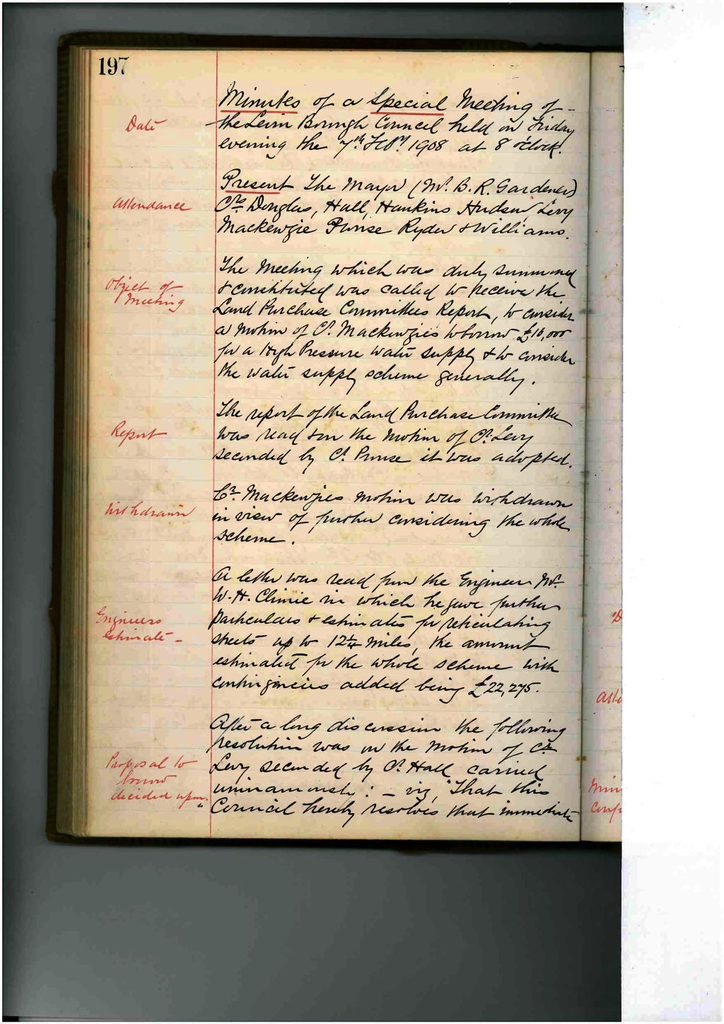 The meeting which was duly summoned & constituted was called to receive the Land Purchase Committees Report, to consider a motion of Cr. Mackenzie’s to borrow ₤16,000 for a High Pressure Water Supply & to consider the water supply scheme generally.