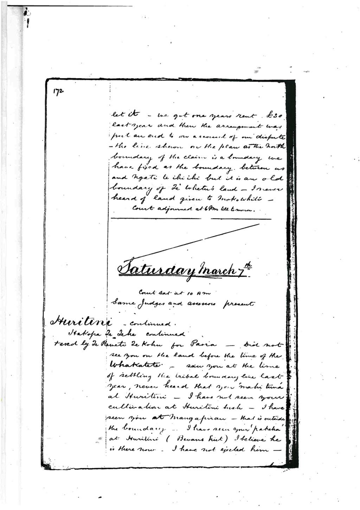 Did not see you on the land before the time of the Whakatete. Saw you at the time of settling the tribal boundary line last year, never heard that you ‘mahi tuna’ at Huritini. I have not seen your cultivation at Huritini bush. I have seen you at Mangapirau, that is outside the boundary. I have seen your ‘pakeha’ at Huritini (Bevans hut). I believe he is there now. I have not ejected him.
