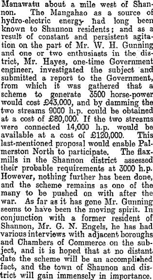 Manawatu about a mile west of Shannon. The Mangahao as a source of hydro-electric energy had long been known to Shannon residents; and as a result of constant and persistent agitation on the part of Mr. W. H. Gunning and one or two enthusiasts in the district, Mr. Hayes, one-time Government engineer, investigated the subject and submitted a report to the Government, from which it was gathered that a scheme to generate 3500 horse-power would cost £43,000, and by damming the two streams 9000 h.p. could be obtained at a cost of £80,000. If the two streams were connected 14,000 h.p. would be available at a cost of £120,000. This last-mentioned proposal would enable Palmerston North to participate. The flaxmills in the Shannon district assessed their probable requirements at 3000 h.p. However, nothing further has been done, and the scheme remains as one of the many to be pushed on with after the war. As far as it has gone Mr. Gunning, seems to have been the moving spirit. In conjunction with a former resident of Shannon, Mr. G. N. Engels, he has had various interviews with adjacent boroughs and Chambers of Commerce on the subject, and it is hoped that at no distant date the scheme will be an accomplished fact, and the town of Shannon and district will gain immensely in importance. >> continued in Part 3 <<