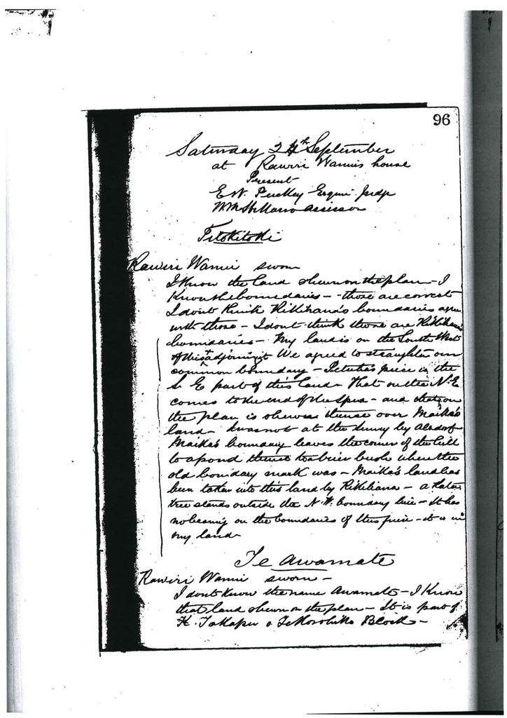 Maika’s boundary leaves the corner of the hill to a pond thence to a brier bush where the old boundary was. Maika’s land has been taken with this land by Rikihana. A Rata tree stands outside the N. W boundary line. It has no bearing on the boundaries of this piece. It is in my land.