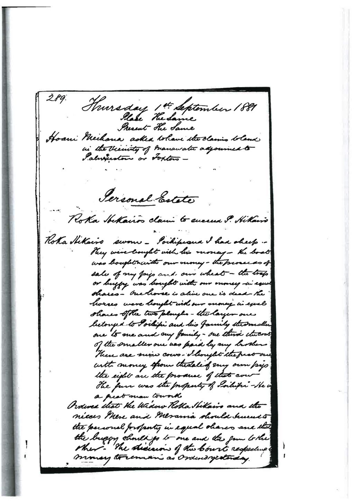 Poihipi and I had sheep. They were bought with his money. The boat was bought with our money. The proceeds of sale of my pigs and our wheat - the trap or buggy was bought with our money in equal shares. One horse is alive – one is dead. The horses were bought with our money in equal shares – of the two ploughs – the larger one belonged to Poihipi and his family. The smaller one to me and my family – one third the cost of the smaller one was paid by my brother. There are nine cows. I bought the first one with money from the sale of my own pigs. The eight are the produce of that cow. The gun was the property of Poihipi. He was a great man to work.