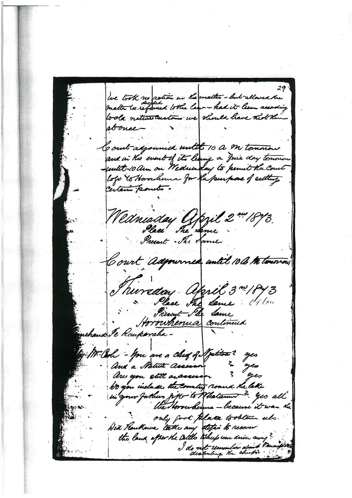 The house was not finished when they went over and burnt Watene’s in the fire. Ngati Raukawa were untitled by the government from taking action of themselves or taking the land into their own hands -In consequence of the word of the government to Watene to go to Waiwiri to live. Watene did so but went constantly back and forward to Raumatangi. I then invited him to accompany me to Waikato to be out of the way. Now the court has arrived and it is being investigated. I do not know about any Muaupoko fishing rights.