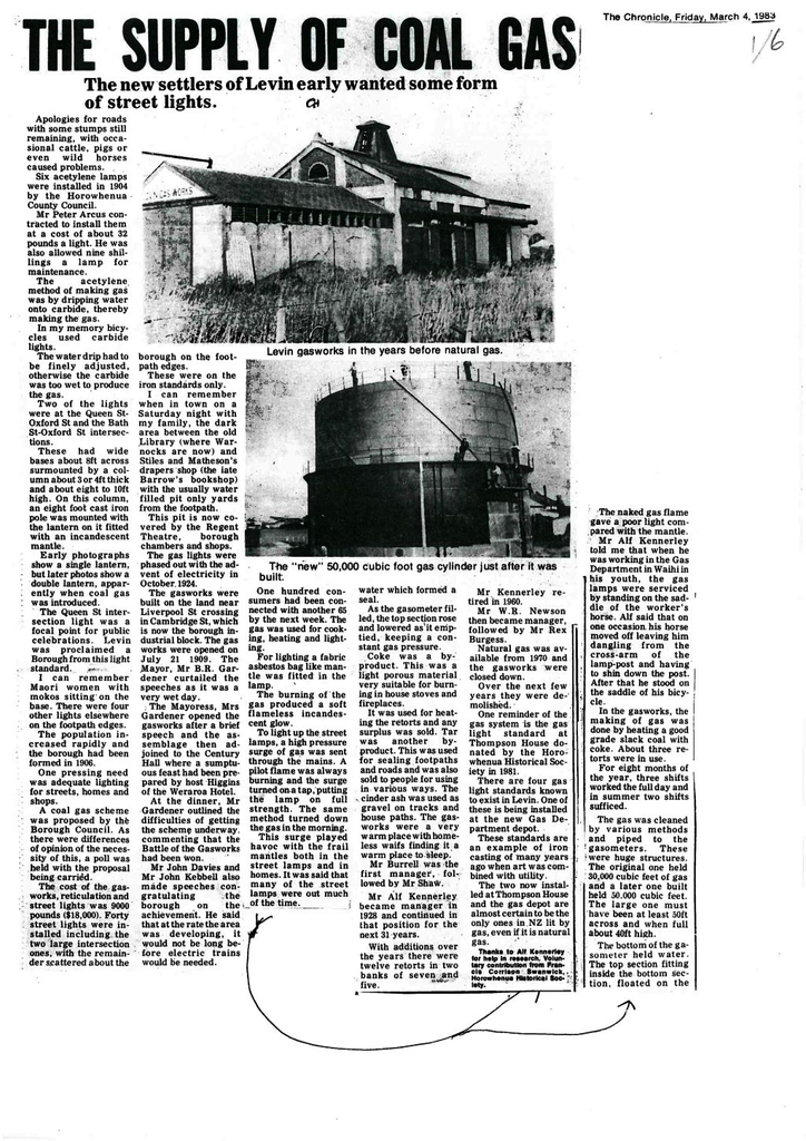 One reminder of the gas system is the light standard at Thompson House donated by the Horowhenua Historical Society in 1981. There are four gas light standards known to exist in Levin. One of these is being installed at the new Gas Department depot. These standards are an example of iron casting of many years ago, when art was combined with utility. The two now installed at Thompson House and the gas depot are almost certain to be the only ones in NZ lit by gas, even if natural gas.