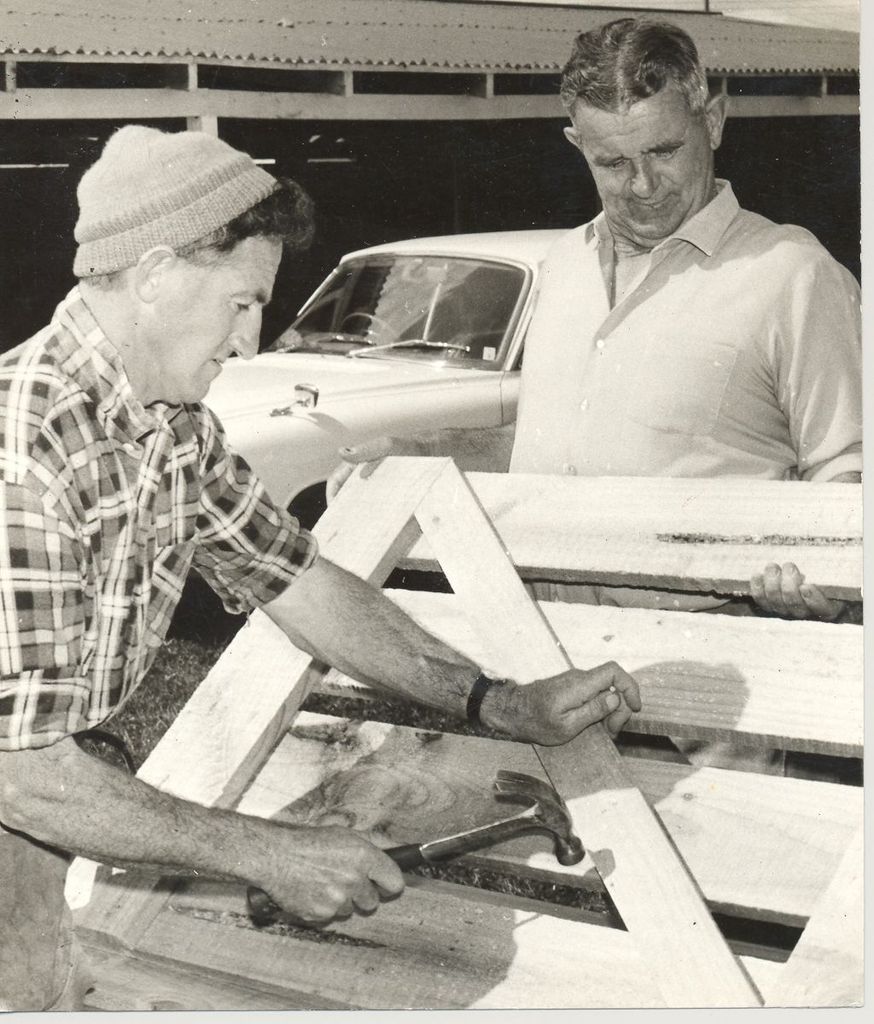 Penciled on back - Shown assembling gates during a working bee of [? by] members of the Horowhenua A.P.I. Assoc. at the pig pavilion are Mr E.L. Hooper (at left) and Mr Clarance Morrison. Sat. Oct. 4, 1969.