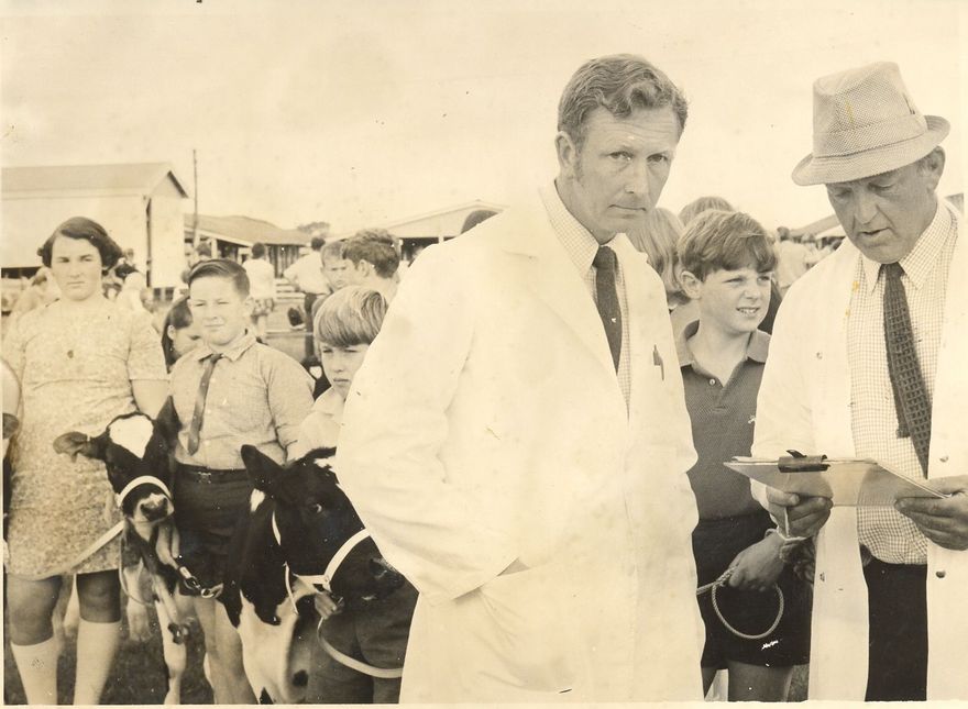 Penciled on back - Final judging of the entries in this years Horowhenua Boys & Girls Agricultural Club’s competition at the Levin Showgrounds. Stewards Mr H. Brown, left, Shannon & Mr O. Phillips, Opiki. Fri. Nov. 17, 1972. See also schools.