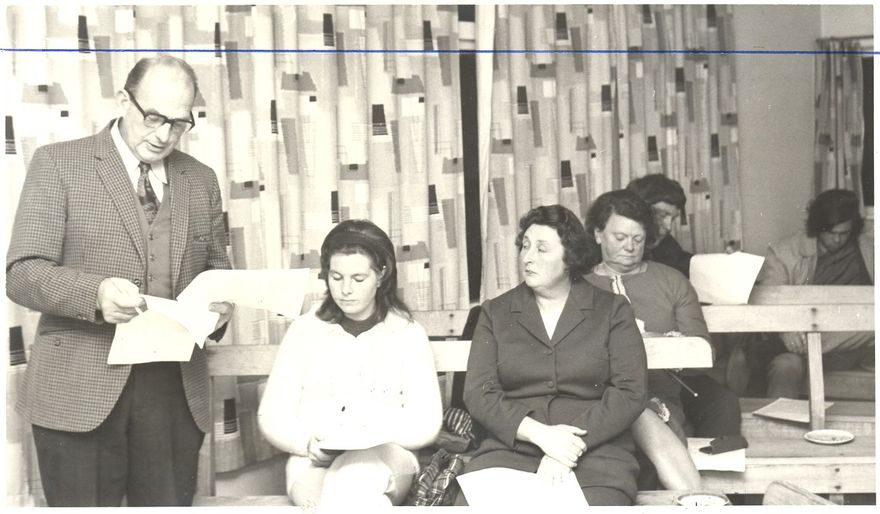 Mr J.E. Bolderson (left), convener of the pool & finance committee, presents his report at the annual meeting of the Levin Amateur Swimming Club. 1 B&W photo print