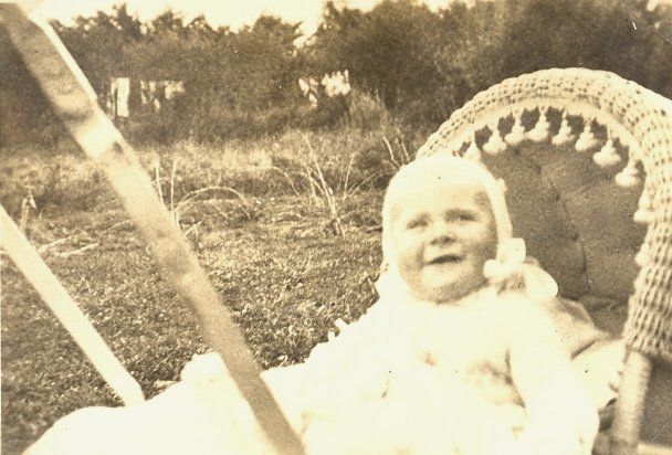 Joyceleyn Astridge (baby) taken at a party at Masterton. Joyceleyn is in her pram. The pram is made of cane very much 1940’s.