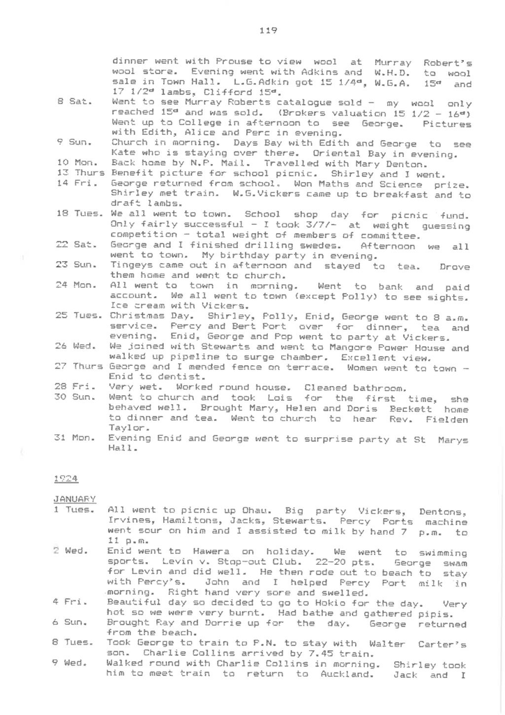 Dec. 6 Sat. Enid went to Plunket Garden Party at Mrs Park's. Left car at SawtelIs as it was going badly. Dec. 10 Wed. Drop in wool at Napier sale. My fleece valued at 25 1/2 to 26 pence. Dec. 11 Thurs. George brought car home from Sawtells. Evening Shirley, Enid and I went to Oratorio "Messiah" by Levin Choral Society assisted by Mrs Woodward and Miss Calder and Messrs Walters and Butler. Also at party of men from Wellington and orchestra from Palmerston Nth.Excellent concert. George finished metric exam. Dec. 12 Fri. Hanson and Barr's men turned up and started to put in wires for electric light. Decided to have light for the car shed. Extra light on the front verandah and point for sweeper. Got estimate for range , hat water and he is to give me details of shearing plant. Dec. 13 Sat. Went to meeting of A & P Assoc. Afterwards Shirley, Lois and I went to Wellington by Napier Mail. Stayed at Fern Hill. After tea Shirley and I went to Town Hall to see wool sold. Sale rather dragging but we sold our wool. 10 bales fine X bred E at 24 1/4 pence - a very satisfactory price. Home late, Edith gave us supper. Dec. 14 Sun. All went to Taranaki St church in morning and in afternoon Shirley, Lois, Helen and I went to zoo. Lois very interested. Percy and Alice over in evening to see us. Dec. 15 Mon. Round town in the morning. Went to Murray Roberts Wool Store to see wool opened up. Compared well with others. Clifford Adkin got 22 1/2 pence; Leslie 22 1/4 pence; Gimblett 23 1/4 pence. Family meeting in the evening. Decided that Will should take over sections 2-3-4 at 2500 pounds and convert house into flats - a further payment of up to 1750 pounds when the speculation proved remunerative. In event of sale of Section 2 with house, the family be given the option of participating in any surplus that may accrue after paying W.H.D. for use of money and other expenses. Dec. 16 Tues. Returned home by New Plymouth Mail. George met us - home for dinner. Dec. 23 Tues. I killed 2 lambs for Christmas for Vickers, Stewarts, Ports and Dentons. Dec. 24 Wed. Shirley,Lois and I went to town in morning for shopping and paying accounts. Met Napier Mail and brought Edith and Kate home to spend Christmas with us. Edith and Kate looked after the house while the rest of us went to Levin for Christmas Eve. Dec. 25 Thurs. Christmas Day Shirley, George, and Enid went to 7 a.m. communion. Had lots of fun inspecting presents. Children got tremendous heaps of them. At home all day. Mr and Miss Port here in afternoon. Dec. 26 Fri. Up late but decided to go to the beach. Left about midday and had a very enjoyable day. Used Shirley's new umbrella shelter. Dec. 28 Sun. Jack, George, Edith and Kate went to Methodist Church in morning. Shirley, Enid and I to Church of England in evening. (Rev. Fielden Taylor). Dec. 31 Wed. In evening Katie shouted Edith, Shirley and me to pictures 'Hunchback of Notre Dame' Very good. Enid and George to Gorringe's party.