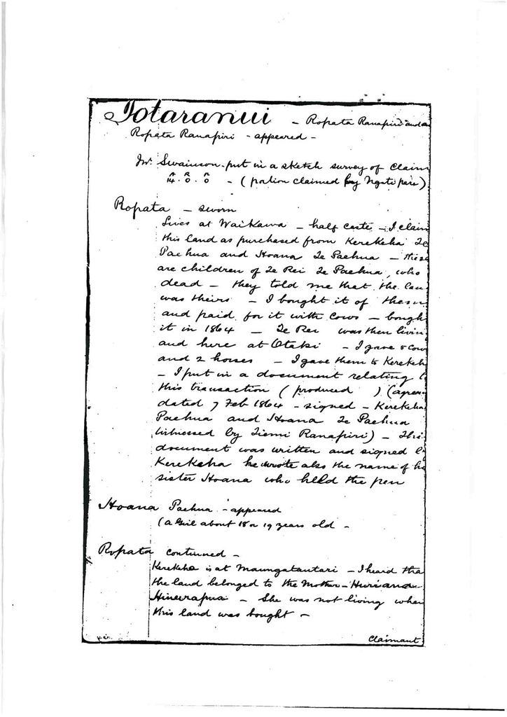 I claim this land as purchased from Kerekeha Te Paehua and Hoana Te Paehua. These are children of Te Rei Te Paehua, who died. They told me that the land was theirs. I bought it off them and paid for it with cows – bought it in 1864. Te Rei was then living and here at Otaki. I gave 5 cows and 2 horses. I gave them to Kerekeha. I put in a document relating to this transaction (produced) (agreement dated 7 February 1864- signed – Kerekeha Paehua and Hoana Te Paehua, witnessed by Tiemi Ranapiri). This document was written and signed by Kerekeha. He wrote also the name of his sister Hoana who held the pen.