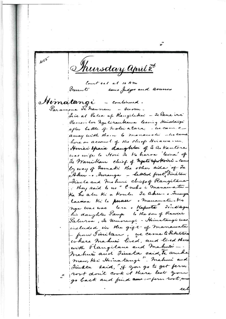 There were no boundaries named when the land was given to us - parts of Manawatu on both sides to the mouth. When we returned, we gave back these lands to Rangitane. In those days it belonged to Ngatiapa and Rangitane. Since the ‘whakapono’ the land, this side of Manawatu is Ngatiraukawa’s. It is yours and Muaupoko now. I won’t say whether it is not Ngatiapa and Rangitane. The other side belonged to Ngatiapa and Rangitane also Muaupoko – not Ngatiraukawa.