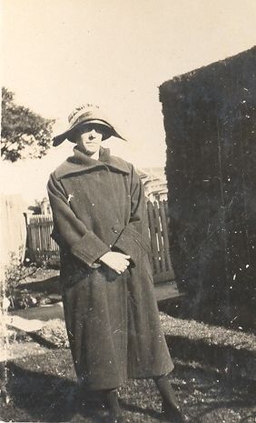 Photograph of a lady standing outside a building. Probably on a cold day as she is wearing a coat and hat with a very large brim.