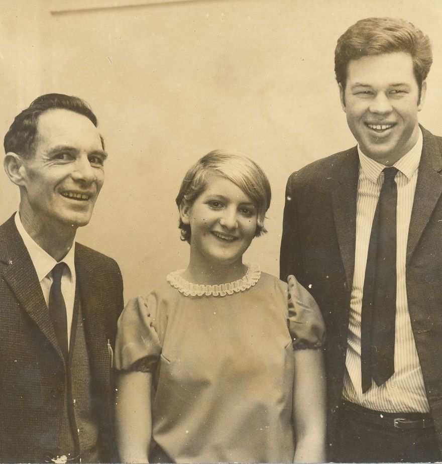 Penciled on back - Mr Marshall, newly elected president of the Levin Amateur Swimming Club with Brenda Nelson, and her coach Mr R.J. Treloar. Fri. Oct. 24, 1969.