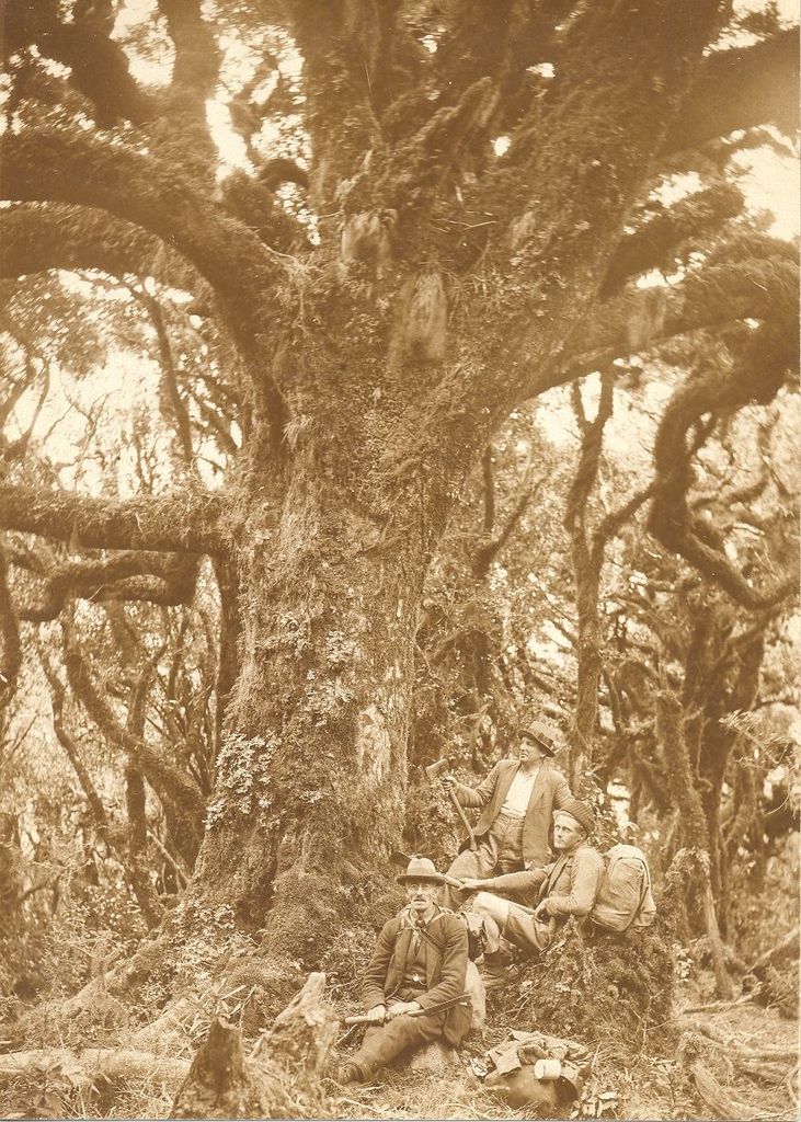 Waiopehu Track – Working Party (Sept 17-18 1927) 1 Sepia tone print Massive Beech tree on ridge below hut site 3 men – Ernie Lancaster, Joe Logan, Bill Harris (L-R)