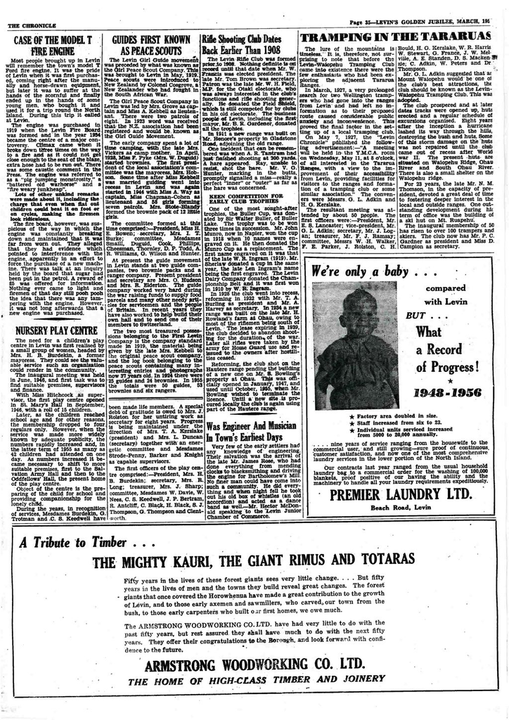 4) Rifle shooting club dates back earlier than 1908.The Levin Rifle Club was formed prior to 1908. Nothing definite is on record until that date when Mr. W. Francis was elected president. The late Mr. Tom Brown was secretary. Patron was the late Mr. W. H. Field, M.P. for the Otaki electorate, who was always interested in the club's functions and rifle shooting generally. He donated the Field Shield, which is still competed for by clubs in his own electorate. The business people of Levin, including the first mayor, Mr. B. R. Gardener, donated all the trophies.
