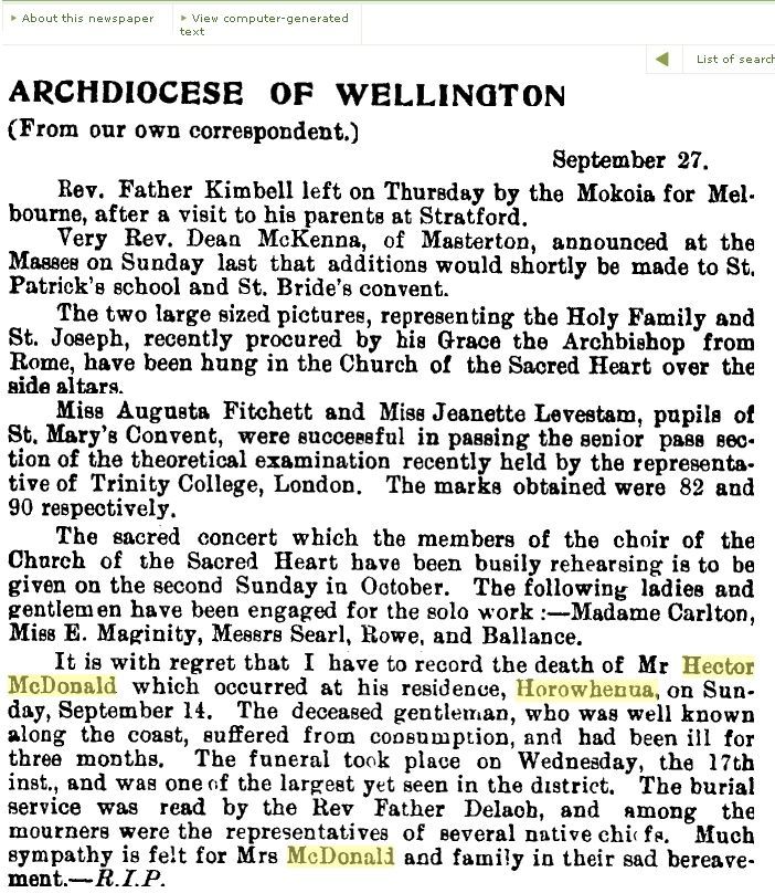 "It is with regret that I have to record the death of Mr Hector McDonald which occurred at his residence, Horowhenua, on Sunday, September 14.