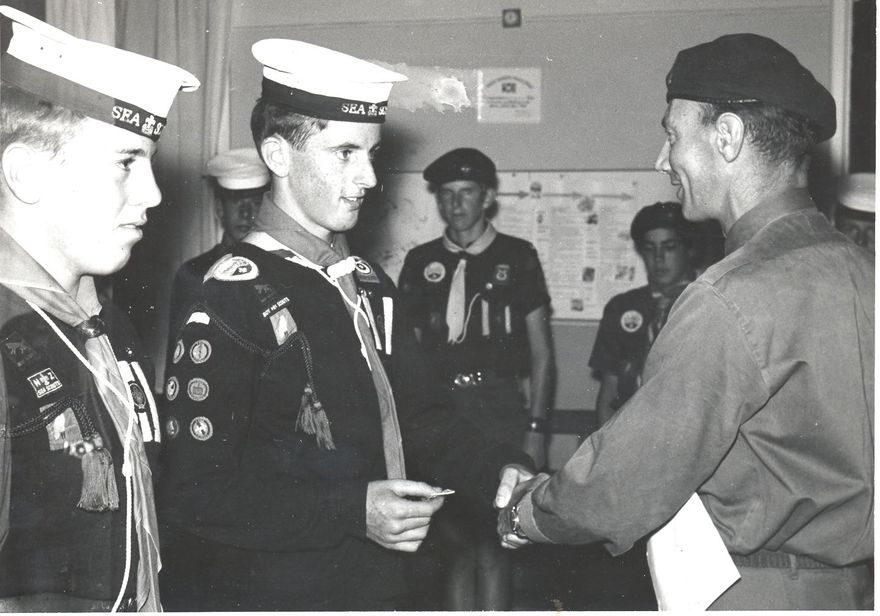 Recipients of the first 2 Chief Scouts’ Awards in Horowhenua are Sea Scouts Senior Coxswain J. Bilderbeck (left) & Coxswain B. Rennie (centre), being presented by District Commissioner J. Morrison (right).