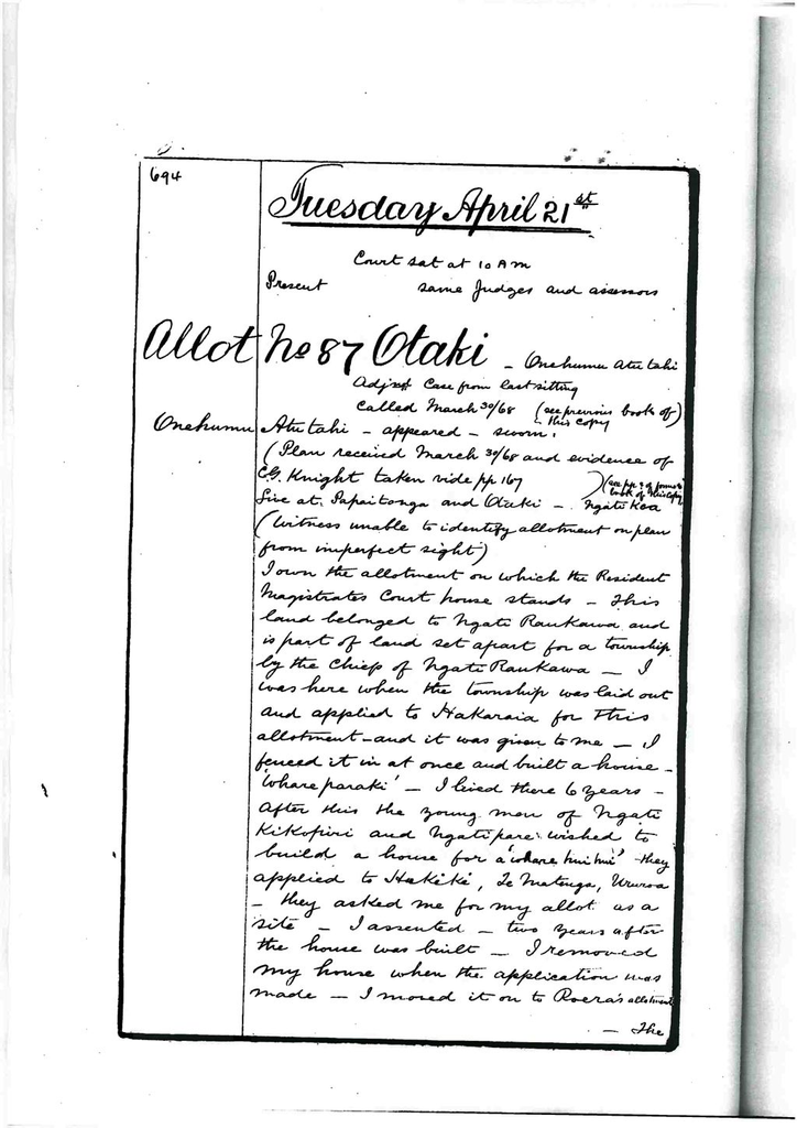 I own the allotment on which the Resident Majestrates Court House stands. This land belonged to Ngatiraukawa and is part of land set apart for a township by the chiefs of Ngatiraukawa. I was here when the township was laid out and applied to Hakaraia for this allotment and it was given to me. I fenced it in at once and built a house ‘whareparaki’. I lived there 6 years. After this the young men of Ngati KiKopiri and Ngatipare wished to build a house for a “whare hui hui’. They applied to Hukiki Te Matenga Ururoa. They asked me for my allot as a site. I assented. Two years after the house was built, I removed my house when the application was made. I moved it on to Roera’s allotment. The house which was built is a court house. It was probably built by the government. I did not ask for any rent or payment for the land. The house was built. I apply for a certificate because the government has possession of the house.